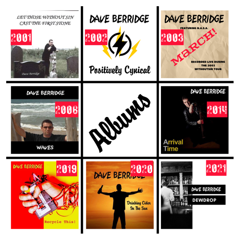 My first solo album, Let Those Without Sin Cast The First Stone was completed in 2001 and is an experimental affair really. Following a domestic hiccup which involved me getting chased out of town, all I was left with was experimental analogue tapes and digtal samples. Positively Cynical was recorded digitally in 2003 and is a far more coherent collection of songs following some advice from former Vibrators and Stranglers guitarist John Ellis. To promote the album I did a week long, 4 date mammoth tour of the East Midlands and the result is the live album March. Waves is a collection of songs recorded over a two year period in a couple of locations with recording techniques that were a little alien to me. The album was eventually released in 2006. Arrival Time arrived in 2014 followed in 2020 by the obligatory lockdown album Drinking Cider In The Sun.